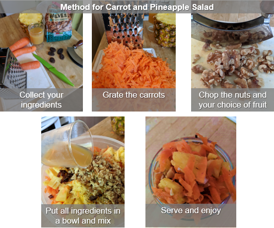 Carrot salad is a tasty cool addition to a green salad on any plate. My favorite ingredients are carrots, pineapple (tinned in juice or fresh), a touch of orange juice, ¼ cup chopped nuts (mixed, walnuts or almonds), and ¼ cup raisins (sultanas or chopped dried fruit). Options include adding a touch of heat with chili flakes or going cinnamon. (Leftovers keep well for a few days in the fridge)